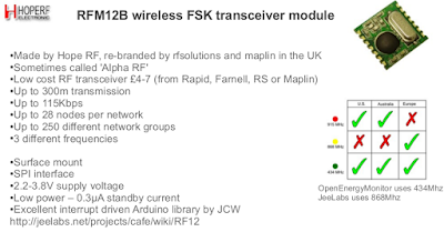 We use the RFM12B wireless transceiver module as an integral part of our emonTx design. Here's a bit of general information about the module.