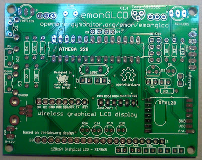 Introducing the current version of the emonGLCD. This post is a bit later than planned, we have actually been selling the V1.4 through the shop for the past month or so. This version features some minor incremental improvements rather than a new design.