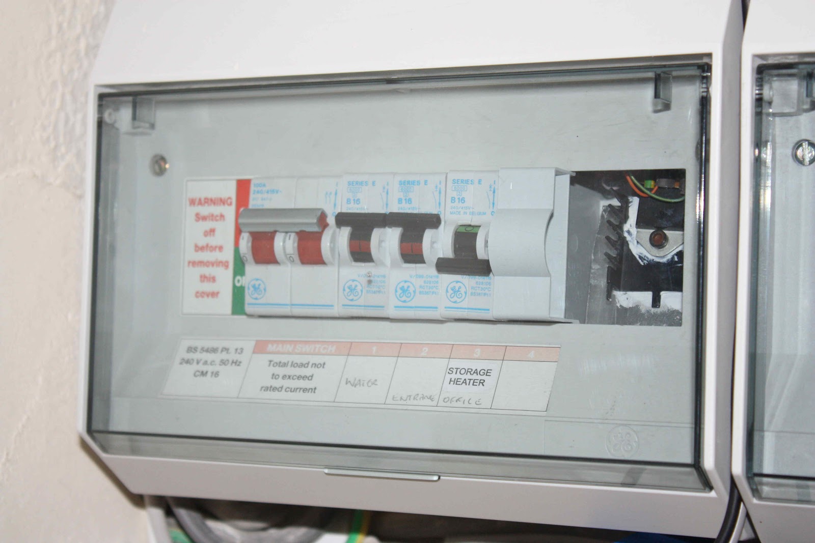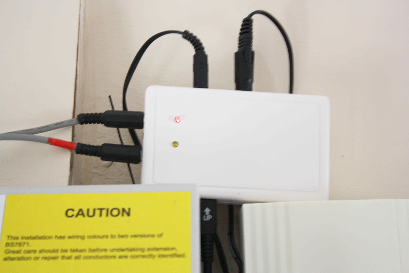 The emonTx with CT1 connected to the Grid, and CT3 connected to the Solar PV generation meter, AC psu and 5v USB supply are also connected.