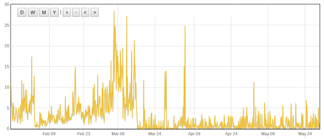 The next graph is the last server load related graph, it shows the time in seconds taken by the server to serve all requests, you can see again the time saved by the emoncms v5 implementation of input processing (the change of gradient on the 16th of March). High load events are also clearly visible as steps, some of these events made emoncms.org unresponsive for quite sometime, one of the larger high load events lasted 40 mins.