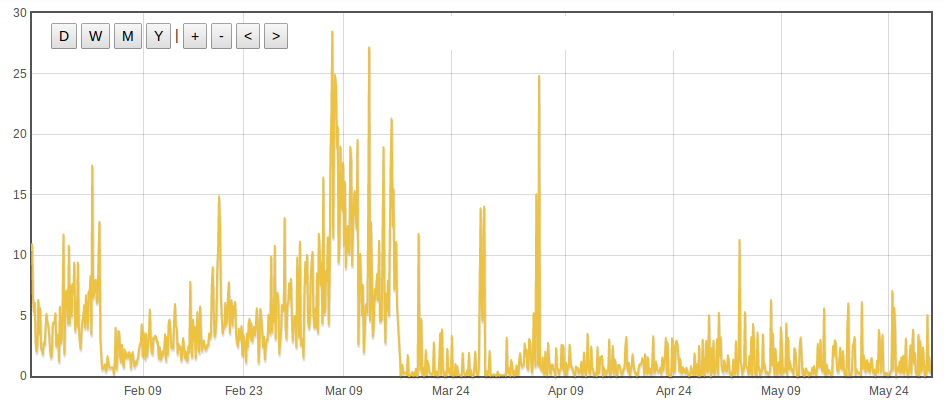 The next graph is the last server load related graph, it shows the time in seconds taken by the server to serve all requests, you can see again the time saved by the emoncms v5 implementation of input processing (the change of gradient on the 16th of March). High load events are also clearly visible as steps, some of these events made emoncms.org unresponsive for quite sometime, one of the larger high load events lasted 40 mins.