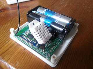 The design so far has got options for DS18B20 temperature sensor or DHT22 sensor for humidity & temperature. External sensors can be connected via terminal block (not soldered in on prototype). The enclosure can be wall mountable. The unit will be battery powered with option for mini-usb power. We have estimated around 6-9 months battery. I hope we might be able to get a year or so battery life with optimization and slowing down the readings to once every few min.
