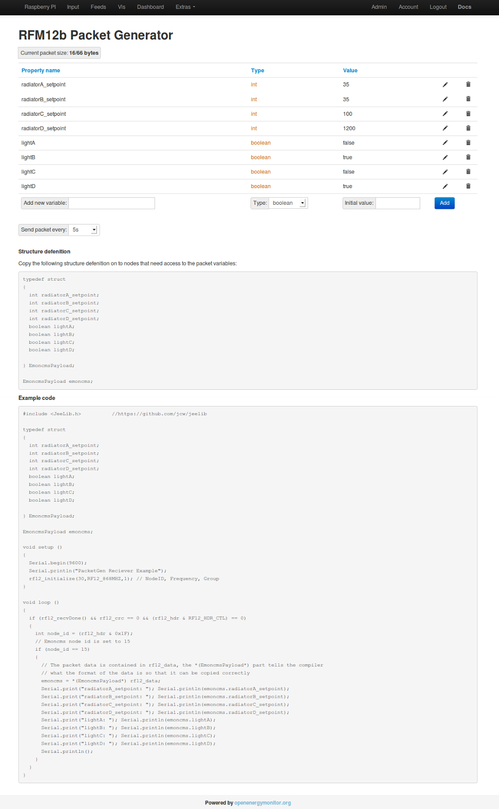 Adding control to emoncms: RFM12b Packet Generator