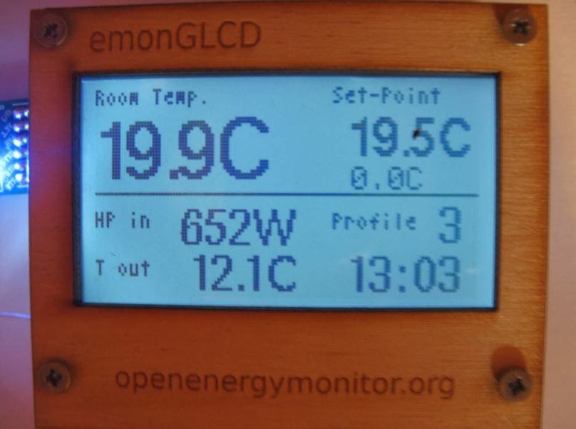 I visited John cantor of http://heatpumps.co.uk/ today who is implementing an impressive control and monitoring system for a heatpump central heating system which involves EmonGLCD's with relay's connected to radiator valve actuators in each room. The buttons on the EmonGLCD are used to set the target temperature for the room and information is displayed on the EmonGLCD about heatpump power input and outside temperature.