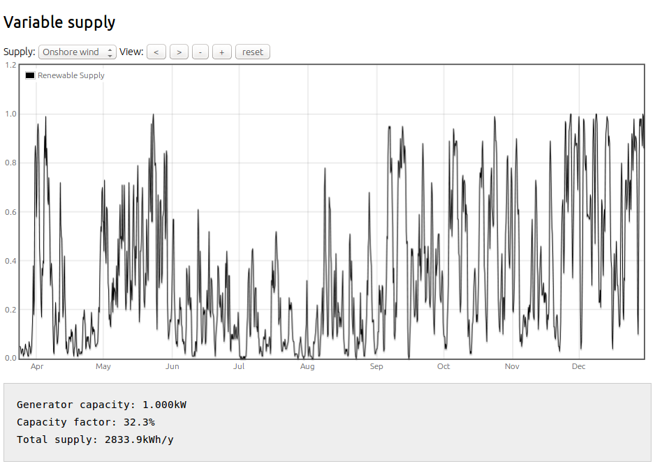 This example is useful for just seeing what the ZeroCarbonBritain renewable capacity factor dataset looks like, you can zoom and pan through the datasets for onshore wind, offshore wind, tidal, wave and solar pv, click on the link below to open the tool: