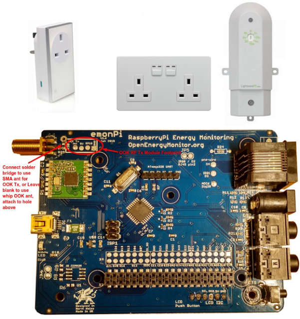 Existing LightWaveRF remotes can be emulated allowing plugs to be controlled from either emonPi MQTT or via the remote.