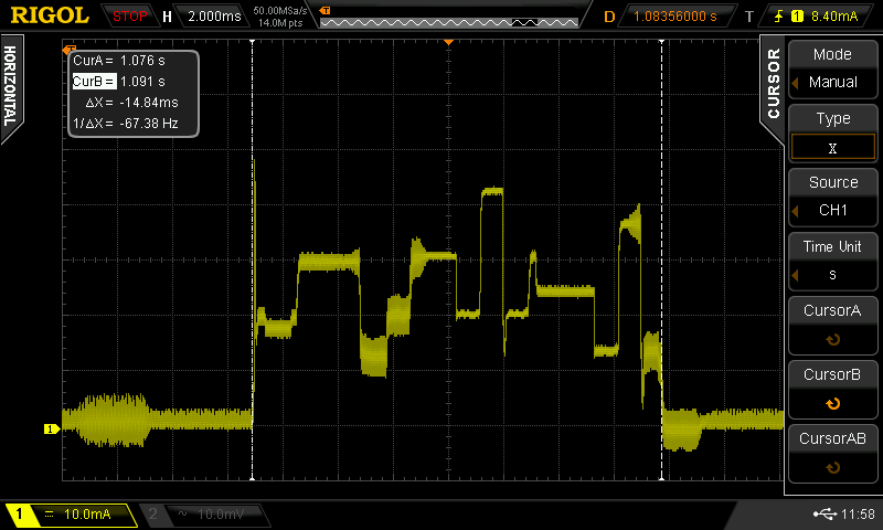 Here is a current capture waveform of the SRF transmitting two LLAP packets, it's rather more interesting than the RFM12B, I would love to know exactly what the SRF is doing at each spike and dip.