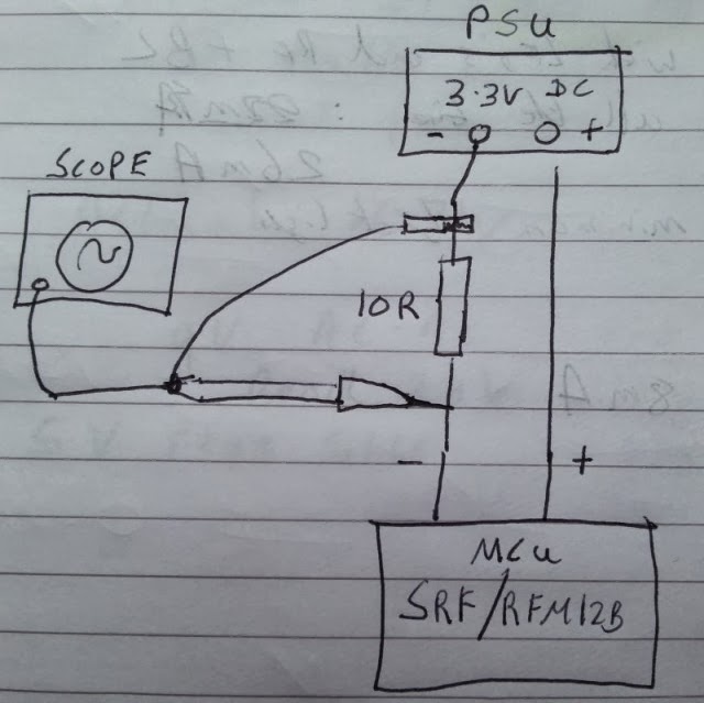 An interesting observation is that the SRF exhibits a rather high current spike of about 50mA as it's turned on / comes out of sleep. As this spike only lasts for only about 100nS it won't contribute that much to the overall power consumption.