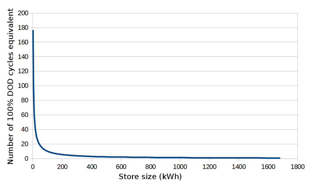 The following graph charts annual cycle requirements vs storage size, highlighting how most of the storage requirement is cycled very infrequently. A 25 kWh store delivers the equivalent charge/discharge energy of 30 full cycles a year, 100% depth of discharge (DOD). The next 120 kWh would only be cycled 7.3 times a year. A 625 kWh store would only be cycled twice in a year and the full 1680 kWh store only 0.8 times a year.